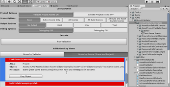When objects have been identified with validation issues either in a scene or project, it is easy to identify them! By using the Asset Validator editor window, you can easily navigate to where these objects reside and ping them, making them pop out in the Unity Editor. This way when there are validation issues, it is easy to identify, find, and fix them.